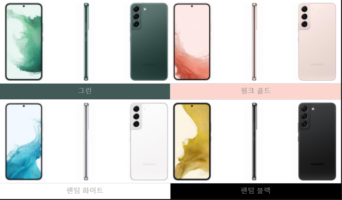 * 삼성닷컴에서만 구매할 수 있는 S22+ 컬러는 그라파이트, 바이올렛, 스카이 블루, 크림이 있다.